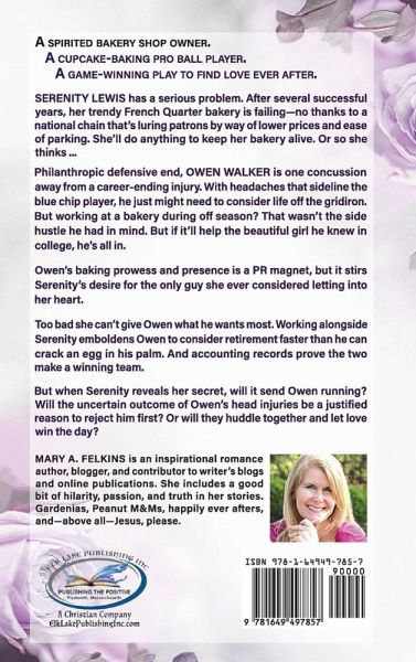 A spirited bakery shop owner. A cupcake-baking pro ball player. A game-winning play to find love ever after. SERENITY LEWIS has a serious problem. After several successful years, her trendy French Quarter bakery is failing-no thanks to a national chain that's luring patrons by way of lower prices and ease of parking. She'll do anything to keep her bakery alive. Or so she thinks ... Philanthropic defensive end, OWEN WALKER is one concussion away from a career-ending injury. With headaches that sideline the blue chip player, he just might need to consider life off the gridiron. But working at a bakery during off season? That wasn't the side hustle he had in mind. But if it'll help the beautiful girl he knew in college, he's all in. Owen's baking prowess and presence is a PR magnet, but it stirs Serenity's desire for the only guy she ever considered letting into her heart. Too bad she can't give Owen what he wants most. Working alongside Serenity emboldens Owen to consider retirement faster than he can crack an egg in his palm. And accounting records prove the two make a winning team. But when Serenity reveals her secret, will it send Owen running? Will the uncertain outcome of Owen's head injuries be a justified reason to reject him first? Or will they huddle together and let love win the day?