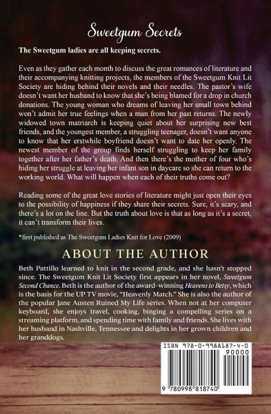 The Sweetgum ladies are all keeping secrets. Even as they gather each month to discuss the great romances of literature and their accompanying knitting projects, the members of the Sweetgum Knit Lit Society are hiding behind their novels and their needles. The pastor's wife doesn't want her husband to know that she's being blamed for a drop in church donations. The young woman who dreams of leaving her small town behind won't admit her true feelings when a man from her past returns. The newly widowed town matriarch is keeping quiet about her surprising new best friends, and the youngest member, a struggling teenager, doesn't want anyone to know that her erstwhile boyfriend doesn't want to date her openly. The newest member of the group finds herself struggling to keep her family together after her father's death. And then there's the mother of four who's hiding her grief at leaving her infant son in daycare so she can return to the working world. What will happen when each of their truths comes out? Reading some of the great love stories of literature might just open their eyes to the possibility of happiness if they would let their secrets out. Sure, it's scary, and there's a lot on the line. But the truth about love is that as long as it's a secret, it can't transform their lives. *first published as The Sweetgum Ladies Knit for Love (2009)