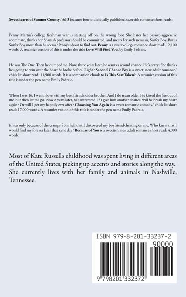 Sweethearts of Sumner County, Vol 3 features four individually published, sweetish romance short reads: Penny Martin's college freshman year is starting off on the wrong foot. She hates her passive-aggressive roommate, thinks her Spanish professor should be committed, and meets her arch nemesis, Surfer Boy. But is Surfer Boy more than he seems? Penny's about to find out. Penny is a sweet college romance short read: 12,100 words. A steamier version of this is under the title Love Will Find You, by Emily Padraic. He was The One. Then he dumped me. Now, three years later, he wants a second chance. He's crazy if he thinks he's going to win over the heart he broke before. Right? Second Chance Boy is a sweet, new adult romance/ chick lit short read: 11,900 words. It is a companion ebook to Is This Seat Taken?. A steamier version of this title is under the pen name Emily Padraic. When I was 16, I was in love with my best friend's older brother. And I do mean older. He kissed the fire out of me, but then let me go. Now 8 years later, he's interested. If I give him another chance, will he break my heart again? Or will I get my happily ever after? Choosing You Again is a sweet romantic comedy/ chick lit short read: 17,000 words. A steamier version of this title is under the pen name Emily Padraic. It was only because of the cramps from hell that I discovered my boyfriend cheating on me. Who knew that I would find my forever later that same day? Because of You is a sweetish, new adult romance short read: 4,000 words.