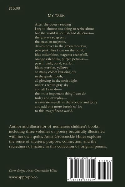 A collection of 194 original poems exploring the sacredness of nature, sense of mystery, search for purpose, essence of being love, power of connecting for change, and the spiritual practice of poetry in community. The poet, Anna Grossnickle Hines, is the author and illustrator of numerous children's books, including three volumes of poetry beautifully illustrated with her own quilts, one of which won the Lee Bennett Hopkins Award for Children's Poetry in 2002.