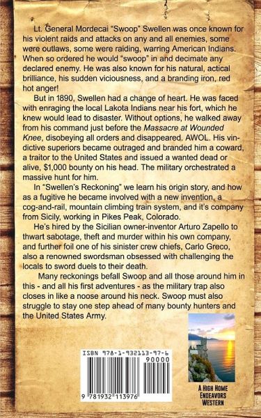 Lt. General Mordecai "Swoop" Swellen was once known for his violent raids and attacks on any and all enemies. Some were criminals, but many were raiding, warring American Indians. When so ordered, he would "swoop" in and decimate any declared enemy. He was also known for his tactical brilliance and sudden viciousness, and his branding iron, red hot anger! But in 1890, Swellen had a change of heart. He was faced with enraging the local Lakota Indians near his fort, which he knew would lead to disaster, or disobeying orders. He walked away from his command just before the massacre at Wounded Knee; disobeying all orders, he disappeared. AWOL. His vindictive superiors branded him a coward, a traitor to the United States and issued a wanted dead or alive $1,000 bounty on his head. The military orchestrated a massive hunt for him. Swellen struggles to stay one step ahead of his many bounty pursuers and the United States Army. In Swellen's Reckoning, we learn his origin story, and how as a fugitive he became involved with a new invention, a mountain-climbing, cog and rail train system, and its company from Sicily, working in Pikes Peak, Colorado. He's hired by the Sicilian owner-inventor Arturo Zapello to thwart sabotage, theft, and murder within his own company, and further foil one of his sinister crew chiefs, Carlo Greco, also a renowned swordsman obsessed with challenging the locals to sword duels to their death. Many reckonings befall Swoop and all those around him in this, his first adventure, as the trap closes in and in..."