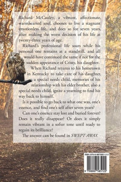 Richard McCauley, a vibrant, affectionate, warmhearted soul, chose to live a stagnant emotionless life, and does so for seven years, after making the worst decision of his life at twenty-three years of age. The reader, embedded in the decision Richard made, is most likely unable to understand or even accept his motives, even when slightly perceiving there may be something more. As Richard's professional life soars, his personal one remains at a halt, and all would have continued the same if not for the sudden appearance of Crissy, his daughter. When Richard goes back to his hometown in Kentucky to take care of his daughter, a special needs child, the memories of the relationship he had had with his elder brother, also a special needs child, and what this brother had sustained in him while growing up, help him remember who he was and initiate a yearning to find his way back. The Ricky he was as a child, adolescent, and youth seem to burst out from friends, his wife, photos and flashbacks, many generously offered by those mentioned. The way Richard's co-workers describe him is also an eye-opener to the reader indicating there is much more than what is initially discerned or that even Richard understands about himself. However, it's his daughter, able to see the Ricky within since the very beginning, who ultimately pushes, without realizing it, to bring out all that was buried inside him, bringing him back to life. The thread of the book, the underlying question of whether it's truly possible to go back to what one was, one's essence, and find one's self after seven years, takes the reader to search for the answer, while at the same time it transcends before their very eyes as each page unfolds. Can one's essence stay lost and buried forever? Does it really disappear? Or does it simply remain vibrant in a softer tone until ready to regain its brilliance once more? The answer can be found in SWEPT AWAY A Story of Just Because.