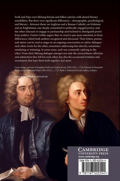 Swift and Pope were lifelong friends and fellow satirists with shared literary sensibilities. But there were significant differences - demographic, psychological, and literary - between them: an Anglican and a Roman Catholic, an Irishman and an Englishman, one deeply committed to politically engaged poetry, and the other reluctant to engage in partisanship and inclined to distinguish poetry from politics. In this book, Dustin Griffin argues that we need to pay more attention to those differences, which both authors recognised and discussed. Their letters, poems, and satires can be read as stages in an ongoing conversation or satiric dialogue: each often wrote for the other, sometimes addressing him directly, sometimes emulating or imitating. In some sense, each was constantly replying to the other. From their lifelong dialogue emerges not only the extraordinary affection and admiration they felt for each other, but also the occasional irritation and resentment that kept them both together and apart.