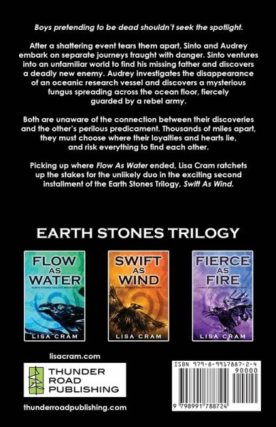 Swift As Wind, the riveting, high-stakes second installment in the Earth Stones Trilogy, begins where Flow As Water left off. Boys pretending to be dead shouldn't seek the spotlight. After a shattering event tears them apart, Sinto and Audrey embark on separate journeys fraught with danger. Sinto ventures into an unfamiliar world to find his missing father and discovers a deadly new enemy. Audrey investigates the disappearance of an oceanic research vessel and discovers a mysterious fungus spreading across the ocean floor, fiercely guarded by a rebel army. Both are unaware of the connection between their discoveries and the other's perilous predicament. Thousands of miles apart, they must choose where their loyalties and hearts lie, and risk everything to find each other. Picking up where Flow As Water ended, Lisa Cram ratchets up the stakes for the unlikely duo in the exciting second installment of the Earth Stones Trilogy, Swift As Wind.