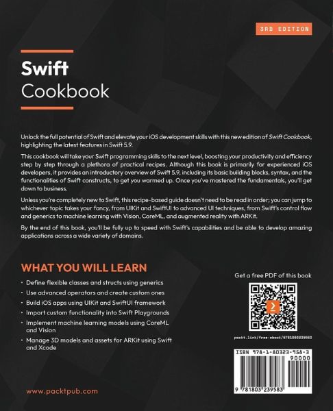 Explore the latest features in Swift and build feature-rich, reliable iOS-native apps in this part-color guide with proven industry-standard recipes, modern design techniques, and strategies beyond the official documentation Key Features: - Harness the power of Swift to create stunning applications, spanning mobile apps to machine learning models - Learn and practice the flexible Swift programming language with a practical, recipe-based approach - Leverage the new features in the latest release of Swift and iOS - Purchase of the print or Kindle book includes a free PDF eBook Book Description: Unlock the full potential of Swift and elevate your iOS development skills with this new edition of Swift Cookbook, highlighting the latest features in Swift 5.9. This cookbook will take your Swift programming skills to the next level, boosting your productivity and efficiency step by step through a plethora of practical recipes. Although this book is primarily for experienced iOS developers, it provides an introductory overview of Swift 5.9, including its basic building blocks, syntax, and the functionalities of Swift constructs, to get you warmed up. Once you've mastered the fundamentals, you'll get down to business. Unless you're completely new to Swift, this recipe-based guide doesn't need to be read in order; you can jump to whichever topic takes your fancy, from UIKit and SwiftUI to advanced UI techniques, from Swift's control flow and generics to machine learning with Vision, CoreML, and augmented reality with ARKit. By the end of this book, you'll be fully up to speed with Swift's capabilities and be able to develop amazing applications across a wide variety of domains. What You Will Learn: - Define flexible classes and structs using generics - Use advanced operators and create custom ones - Build iOS apps using UIKit and SwiftUI framework - Import custom functionality into Swift Playgrounds - Implement machine learning models using CoreML and Vision - Manage 3D models and assets for ARKit using Swift and Xcode Who this book is for: This book is for experienced iOS developers looking to master the diverse features offered by Swift 5.9 along with tips and tricks to efficiently code and build applications. Knowledge of general programming concepts will assist with understanding key concepts. Table of Contents - Swift Fundamentals - Mastering the Building Blocks - Data Wrangling with Swift - Generics, Operators, and Nested Types - Beyond the Standard Library - Understanding Concurrency in Swift - Building iOS Apps with UIKit - Building iOS Apps with SwiftUI - Getting to Grips with Combine - Using CoreML and Vision in Swift - Immersive Swift with ARKit and Augmented Reality - Visualizing Data with Swift Charts