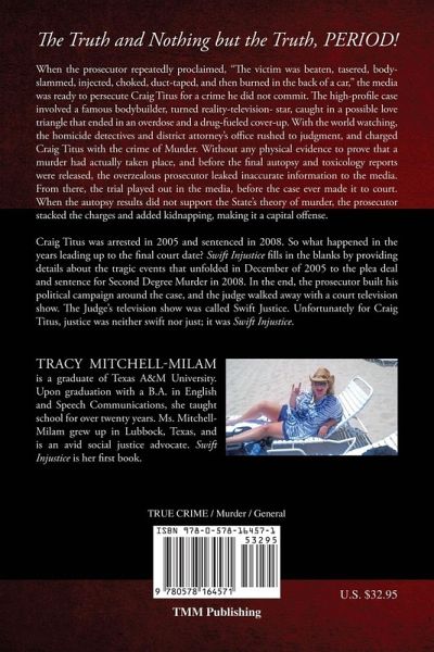 When the prosecutor repeatedly proclaimed, "The victim was beaten, tasered, body- slammed, injected, choked, duct-taped, and then burned in the back of a car," the media was ready to persecute Craig Titus for a crime he did not commit. The high-profile case involved a famous bodybuilder, turned reality-television- star, caught in a possible love triangle that ended in an overdose and a drug-fueled cover-up. With the world watching, the homicide detectives and district attorney's office rushed to judgment, and charged Craig Titus with the crime of Murder. Without any physical evidence to prove that a murder had actually taken place, and before the final autopsy and toxicology reports were released, the overzealous prosecutor leaked inaccurate information to the media. From there, the trial played out in the media, before the case ever made it to court. When the autopsy results did not support the State's theory of murder, the prosecutor stacked the charges and added kidnapping, making it a capital offense. Craig Titus was arrested in 2005 and sentenced in 2008. So what happened in the years leading up to the final court date? Swift Injustice fills in the blanks by providing details about the tragic events that unfolded in December of 2005 to the plea deal and sentence for Second Degree Murder in 2008. In the end, the prosecutor built his political campaign around the case, and the judge walked away with a court television show. The Judge's television show was called Swift Justice. Unfortunately for Craig Titus, justice was neither swift nor just; it was Swift Injustice.
