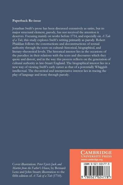 Jonathan Swift's prose has been discussed extensively as satire, but its major structural element, parody, has not received the attention it deserves. Focusing mainly on works before 1714, and especially on A Tale of a Tub, this study explores Swift's writing primarily as parody. Robert Phiddian follows the constructions and deconstructions of textual authority through the texts on cultural-historical, biographical, and literary-theoretical levels. The historical interest lies in the occasions of the parodies: in their relations with the texts and discourses which they quote and distort, and in the way this process reflects on the generation of cultural authority in late-Stuart England. The biographical interest lies in a new way of viewing Swift's early career as that of a potentially Whiggish intellectual. The theoretical and interpretative interest lies in tracing the play of language and irony through parody.