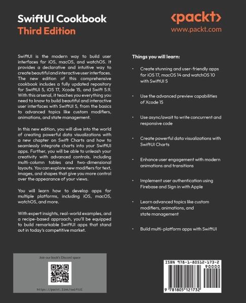 Experience the potential of SwiftUI, Swift 5.9, and Xcode 15 for crafting cutting-edge apps on iOS 17, macOS 14.0 Sonoma, and watchOS 10 Key Features: Unlock advanced controls and animations with SwiftUI 5, taking your app development skills to the next level Visualize data effortlessly using Swift Charts enhancing your app's data-driven capabilities Develop for multiple platforms, including iOS, macOS, and watchOS, and become a versatile app developer Purchase of the print or Kindle book includes a free PDF eBook Book Description: SwiftUI is the modern way to build user interfaces for iOS, macOS, and watchOS. It provides a declarative and intuitive way to create beautiful and interactive user interfaces. The new edition of this comprehensive cookbook includes a fully updated repository for SwiftUI 5, iOS 17, Xcode 15, and Swift 5.9. With this arsenal, it teaches you everything you need to know to build beautiful and interactive user interfaces with SwiftUI 5, from the basics to advanced topics like custom modifiers, animations, and state management. In this new edition, you will dive into the world of creating powerful data visualizations with a new chapter on Swift Charts and how to seamlessly integrate charts into your SwiftUI apps. Further, you will be able to unleash your creativity with advanced controls, including multi-column tables and two-dimensional layouts. You can explore new modifiers for text, images, and shapes that give you more control over the appearance of your views. You will learn to develop apps for multiple platforms, including iOS, macOS, watchOS, and more. With expert insights, real-world examples, and a recipe-based approach, you'll be equipped to build remarkable SwiftUI apps that stand out in today's competitive market. What You Will Learn: Create stunning and user-friendly apps for iOS 17, macOS 14 and watchOS 10 with SwiftUI 5 Use the advanced preview capabilities of Xcode 15 Use async/await to write concurrent and responsive code Create powerful data visualizations with SwiftUI Charts Enhance user engagement with modern animations and transitions Implement user authentication using Firebase and Sign in with Apple Learn advanced topics like custom modifiers, animations, and state management Build multi-platform apps with SwiftUI Who this book is for: This book is for mobile developers who want to learn SwiftUI as well as experienced iOS developers transitioning from UIKit to SwiftUI. The book assumes knowledge of the Swift programming language. Knowledge of object-oriented design and data structures will be useful but not necessary. You'll also find this book to be a helpful resource if you're looking for reference material regarding the implementation of various features in SwiftUI.