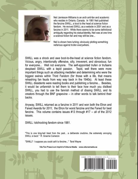 SWILL first appeared thirty-odd years ago as an antifan fanzine that was a boot-to-the-head at science fiction fandom. SWILL returned as a fanzine in 2011 and garnered both the Elron Award and the Faned Award for that year; the Elron for Worst Fanzine and the Faned for Best Fanzine. This volume contains issues #13 through #17 -- all of the 2012 issues of SWILL. SWILL: Tolchocking fandom since 1981.