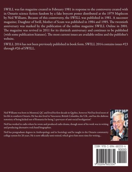 SWILL was fan magazine created in February 1981 in response to the controversy created with in Ontario science fiction fandom by a fake boycott poster distributed at the 1979 Maplecon by Neil Williams. Because of this controversy, the SWILL was published during 1981. A successor magazine; Daughter of Swill, Mother of Scum was published in 1984 and 1985. The twentieth anniversary was marked by the publication of the online magazine SWILL Online in 2001. The magazine was revived in 2011 for the thirtieth anniversary and continues to be published (with some publication hiatuses). The most current issues are available online and the publisher's website. SWILL 2014 has not been previously published in book form. SWILL 2014 contains issues #23 through #26 of SWILL.