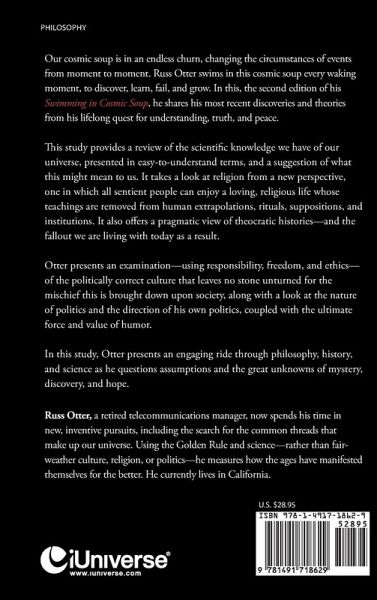 Our cosmic soup is in an endless churn, changing the circumstances of events from moment to moment. Russ Otter swims in this cosmic soup every waking moment, to discover, learn, fail, and grow. In this, the second edition of his Swimming in Cosmic Soup, he shares his most recent discoveries and theories from his lifelong quest for understanding, truth, and peace. This study provides a review of the scientific knowledge we have of our universe, presented in easy-to-understand terms, and a suggestion of what this might mean to us. It takes a look at religion from a new perspective, one in which all sentient people can enjoy a loving, religious life whose teachings are removed from human extrapolations, rituals, suppositions, and institutions. It also offers a pragmatic view of theocratic histories-and the fallout we are living with today as a result. Otter presents an examination-using responsibility, freedom, and ethics-of the politically correct culture that leaves no stone unturned for the mischief this is brought down upon society, along with a look at the nature of politics and the direction of his own politics, coupled with the ultimate force and value of humor. In this study, Otter presents an engaging ride through philosophy, history, and science as he questions assumptions and the great unknowns of mystery, discovery, and hope.