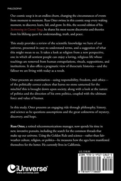 Our cosmic soup is in an endless churn, changing the circumstances of events from moment to moment. Russ Otter swims in this cosmic soup every waking moment, to discover, learn, fail, and grow. In this, the second edition of his Swimming in Cosmic Soup, he shares his most recent discoveries and theories from his lifelong quest for understanding, truth, and peace. This study provides a review of the scientific knowledge we have of our universe, presented in easy-to-understand terms, and a suggestion of what this might mean to us. It takes a look at religion from a new perspective, one in which all sentient people can enjoy a loving, religious life whose teachings are removed from human extrapolations, rituals, suppositions, and institutions. It also offers a pragmatic view of theocratic histories-and the fallout we are living with today as a result. Otter presents an examination-using responsibility, freedom, and ethics-of the politically correct culture that leaves no stone unturned for the mischief this is brought down upon society, along with a look at the nature of politics and the direction of his own politics, coupled with the ultimate force and value of humor. In this study, Otter presents an engaging ride through philosophy, history, and science as he questions assumptions and the great unknowns of mystery, discovery, and hope.