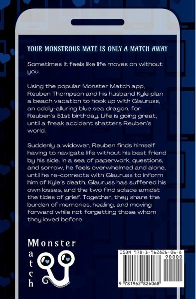 Sometimes it feels like life moves on without you. Using the popular Monster Match app, Reuben Thompson and his husband Kyle plan a beach vacation to hook up with Glauruss, an oddly-alluring blue sea dragon, for Reuben's 51st birthday. Life is going great, until a freak accident shatters Reuben's world. Suddenly a widower, Reuben finds himself having to navigate life without his best friend by his side. In a sea of paperwork, questions, and sorrow, he feels overwhelmed and alone, until he re-connects with Glauruss to inform him of Kyle's death. Glauruss has suffered his own losses, and the two find solace amidst the tides of grief. Together, they share the burden of memories, healing, and moving forward while not forgetting those whom they loved before. Swimming in Grief is a monster-human romance and part of season 2 of the Monster Match collection. It is a standalone story with its own HEA.
