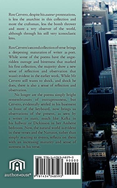 Ron Cervero's second collection of verse brings a deepening maturation of writer as poet. While some of the poems have the angst-ridden outrage and bitterness that marked his first collection, the majority show a new sense of reflection and observation that wasn't evident in the earlier work. While Mr Cervero still wants to shock, and shock he does, there is also a sense of reflection and observation. No longer are the poems simply bright remembrances of outrageousness, but Cervero, evidentally settled in his basement in front of the keyboard, now brings us observations of the present, as seen by a writer in statis, much like Kafka in his hallway or Dickinson in her Amherst bedroom. Now, the natural world is evident in these verses and the Narrator, rather than simply reacting to events, reflects on them with an increasing maturity and sense of sureness in his verse.