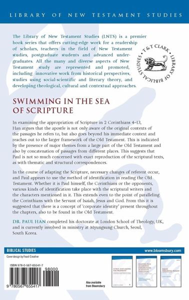 In examining the appropriation of Scripture in 2 Corinthians 4-13, Han argues that the apostle is not only aware of the original contexts of the passages he refers to, but also goes beyond the immediate contexts and brings in the larger context of the Old Testament. In the course of adapting the Scripture, necessary changes of referent occur and Paul appears to use the method of identification in reading the Old Testament. Whether it is Paul himself, the Corinthians or the opponents, various kinds of identification take place with the scriptural writers and the characters mentioned in it. This identification extends even to the point of identifying the Corinthians with the Servant of Isaiah, Jesus and God. From this it is suggested that there is a concept of 'corporate identity' present throughout the chapters, which is also seen in the Old Testament. In many cases Paul's basic thrust is sufficiently clear even without any understanding of scriptural references he makes. This is because Paul often makes a rhetorical use of the Scripture by citing a text at climactic points or near the closing of a section he is developing to strengthen his points, even as he brings in the 'big picture' of the Old Testament.