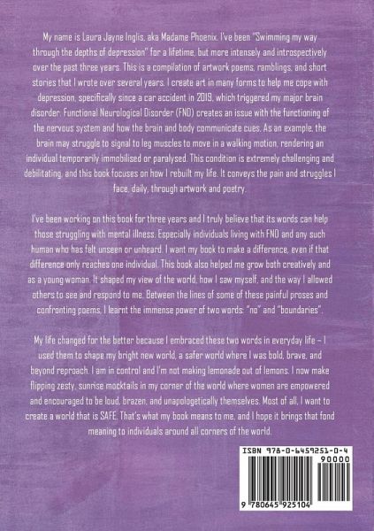 Swimming my way through the depths of Depression My legal name is Laura Jayne Inglis and my artist's name is Madame Phoenix. I am 33 years old and have been working on my book, "Swimming my way through the depths of Depression" for the last three years. It is a compilation of artwork poems, ramblings, and short stories I have written over the years to cope with my depression, specifically since a car accident in 2019 which triggered a major brain disorder - Functional Neurological Disorder (FND). The car accident ultimately caused me to lose almost everything. My career working with children, my license and a lot of my independence and many friends and loved ones who couldn't cope with how debilitating this condition was. I had worked as an Outside School Hours Coordinator at Mt Crosby School Hours Coordinator for 9 years prior to the accident - the job, children, and community it created was my life. I was also part of the local Roller Derby league both as a player and their secretary. I was skating up to 20 hours a week prior to the car crash. The lack of socialisation and skating/driving led me to picking up a piece of paper and pencil one day and just drawing and before I knew it, I couldn't stop. I poured my heart out, as dark as it was, and that became my coping mechanism. It is my dream to share my works with the world and help those who live with mental illness, FND and/or have gone through significant trauma like me. I want my book to make a difference. Even if it's to just one individual. Swimming my way through the depths of Depression was written during an extremely turbulent time during my life and there were many people who waivered during the storm and left; for the wind and rain was too heavy for them to carry. However, there were many people who stood still with and for me and for that, I am forever grateful. They are my true mates for life, and I love them dearly. You know who you are. This book also helped me grow both creatively and as an individual and young woman. It helped shape my view of the world as well as how I saw myself and the way I allowed others to see and treat me. Between the lines of some of these painful proses and confronting poems, I learnt the immense power of two words: "No" and "boundaries". My life changed for the better because I embraced these two words in my life and I used them to shape my new world - a safer world where I was bold, brave and beyond reproach. I was in control and I wasn't making lemonade out of lemons I was making flipping zesty, sunrise mocktails in my corner of the world where women were empowered and encouraged to be loud, brazen, and unapologetically themselves but most of all, where we were safe. That is what book, means to me and I hope, brings some same familiar meaning to individuals around the corners of the world. Kind regards,Madame PhoenixLaura Jayne Inglis