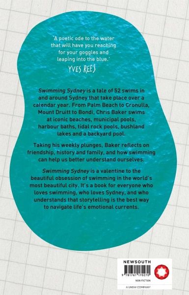 Swimming Sydney is a tale of 52 swims in and around Sydney that take place over a calendar year. From Palm Beach to Cronulla, Mount Druitt to Bondi, Chris Baker swims at iconic beaches, municipal pools, harbour baths, tidal rock pools, bushland lakes and a backyard pool. Taking his weekly plunges, Baker reflects on friendship, history and family, and how swimming can help us better understand ourselves. Swimming Sydney is a valentine to the beautiful obsession of swimming in the world's most beautiful city. It's a book for everyone who loves swimming, who loves Sydney, and who understands that storytelling is the best way to navigate life's emotional currents. 'Part travel guide and part memoir, these 52 immersive essays - one a week - remind us how inextricably Australian culture is linked to water and our bodies. Immerse yourself and emerge invigorated, like the best swims leave you feeling.' - Benjamin Law 'A poetic ode to the water that will have you reaching for your goggles and leaping into the blue. Chris Baker may swim like a fish, but he also writes like a dream. Swimming Sydney is a beguiling portrait of love, loss, community and identity in the world's most swimmable city.' - Yves Rees 'Chris Baker takes a deep dive into the watery history of Sydney, focusing by turns on its conflicted history, ravishing beauty and salty present. His eye for detail is sharper than a gull's, and while his love of the liquid landscapes he traverses is palpable and at times nostalgic, it is never sentimental. Reading his 52 swims made me long to don my togs and to get away from my own daily comfort pool. I ached to rush to a dive-in, to slurp a Sunnyboy or chomp a pluto pup, and above all, to immerse in the "dignified consolation" that he offers in every chapter. This book is both a keeper and a giver, an invitation and a challenge, a guide and a gift; it's a love song to the caress of watery wonder.' - Alisa Piper.