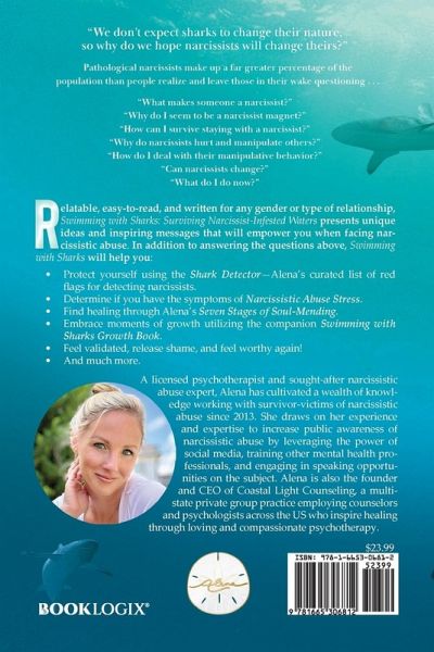 Imagine diving into the deep, mysterious waters of the human psyche, where narcissists lurk like apex predators. In this gripping and eye-opening book, author Alena Scigliano takes you on a journey through the treacherous waters of narcissistic relationships, providing invaluable insights and strategies to help you not only survive but thrive in these challenging environments. Pathological Narcissists make up a far greater percentage of the population than people realize and leave those in their wake questioning:"What makes someone a narcissist?" "Why do I seem to be a narcissist magnet?" "How do I deal with their manipulative behavior?" "What do I do now?" Relatable, easy to read, and written for any gender or type of relationship, Swimming with Sharks: Surviving Narcissist-Infested Waters presents unique ideas and inspiring messages that will empower you when facing narcissistic abuse. In addition to answering the questions above, Swimming with Sharks will help you: Protect yourself using the Shark Detector--Alena's curated list of red flags to assist you in detecting and avoiding relationships with narcissists in the future. Understand what you do and do not have control over. Determine whether or not you have the symptoms of Narcissistic Abuse Stress. Work through the shame all survivor-victims of narcissistic abuse experience. Learn how to heal from narcissistic abuse through Alena's Seven Stages of Soul-Mending. Embrace moments of growth utilizing the companion Swimming with Sharks Growth Book. Why You'll Love Swimming with Sharks: Engaging Stories: Get ready for a rollercoaster of emotions as Alena shares real-life stories that resonate. In-Depth Analysis: Uncover the psychology behind narcissistic behavior and gain a deep understanding of why they do what they do. Empowerment: Learn proven strategies and techniques to protect yourself from narcissistic manipulation and take back control of your life. Personal Growth: Swimming with Sharks isn't just about surviving; it's about growing stronger and wiser through your experiences. DIVE IN TODAY! Prepare to embark on an unforgettable journey through the depths of human behavior and emerge stronger and more resilient. Swimming with Sharks is more than a book; it's a guide to navigating life's turbulent waters with confidence and grace. Don't miss out on the companion "workbook," the Swimming with Sharks Growth Book! Get ready to be captivated, enlightened, and empowered with this powerhouse duo that will take you from surviving narcissistic abuse to thriving within your healed sou