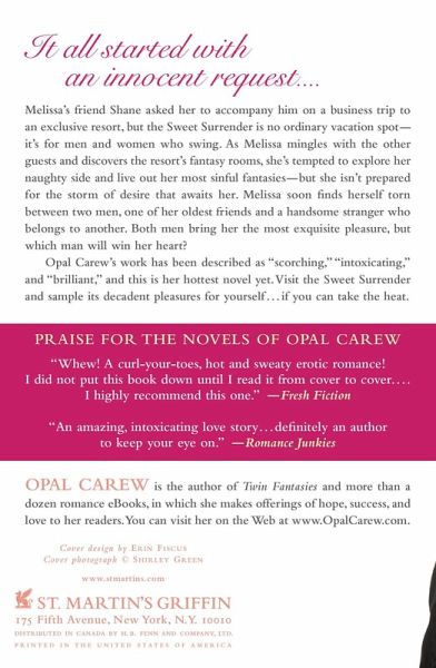 It all started with an innocent request...Melissa's friend Shane asked her to accompany him on a business trip to an exclusive resort. But The Sweet Surrender is no ordinary vacation spot--it's for men and women who swing. As Melissa mingles with the other guests and discovers the resort's fantasy rooms, she's tempted to explore her naughty side and live out her most sinful fantasies-but she isn't prepared for the storm of desire that awaits. She soon finds herself torn between two men, one of her oldest friends and a handsome stranger who belongs to another. Both men bring her the most exquisite pleasure, but which man will win her heart? Her work has been described as "scorching," "intoxicating" and "brilliant," and this is Opal Carew's hottest novel yet. Visit The Sweet Surrender and sample its decadent pleasures for yourself...if you can take the heat.