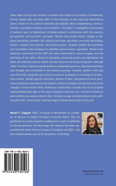 Swiss Maid corrects the omission of women from historical narratives of Switzerland. Women helped with herculean effort in the formation of the small but extraordinary nation, known for its political neutrality and stability, fierce independency, multiculturalism, successful economy, and innovation. The author's investigation and analysis of women's work in Switzerland correlates women's contributions with the country's sociopolitical and economic successes. Women have made historic change in religious institutions, domestic life, artisanry and trade, education, care work, the military, politics, industry and business, and service sectors. Chapters present the qualitative and quantitative data necessary to establish socioeconomic arguments. Women have indirectly contributed to the GNP but more importantly to social progress and the well-being of the nation. Stories of exemplary, pioneering women are highlighted, but silent and silenced common women are also featured and finally recognized. Although Judeo-Christian traditions placed women in subservient positions, they developed their own strength and contributed to the national economy. However, women's work was not sufficiently recognized and valued because of inadequate accounting and productivity models. Gender-specific education, division of labor, and gendered social structures of previous centuries are discussed in relation to women's productivity and social changes in more recent times. Multifactor productivity concepts and social progress measurements shed light on the value of women's work and care. Portraits of historical and contemporary women attest to their intrepid courage and extraordinary yield, without which the "Swiss brand" and the image of Switzerland could not flourish.
