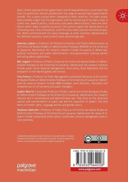 Swiss citizens approve of their government and the way democracy is practiced; they trust the authorities and are satisfied with the range of services Swiss governments provide. This is quite unusual when compared to other countries. This open access book provides insight into the organization and the functioning of the Swiss state. It claims that, beyond politics, institutions and public administration, there are other factors which make a country successful. The authors argue that Switzerland is an interesting case, from a theoretical, scientific and a more practice-oriented perspective. While confronted with the same challenges as other countries, Switzerland offers different solutions, some of which work astonishingly well.