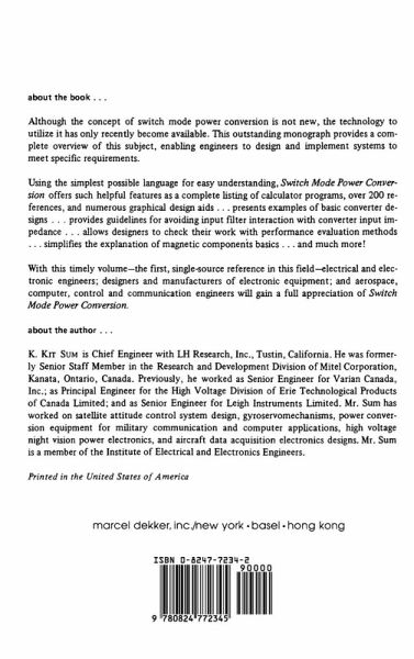 This book presents the fundamentals of switch mode power converters with insights into design aspects, providing elementary explanations of basic concepts of analysis, testing, and measurements of the converters. It is intended for power electronics engineers.