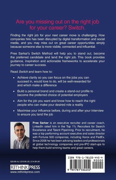 Are you missing out on the right job for your career? Switch. Finding the right job for your next career move is challenging. How companies hire has been disrupted by digital transformation and social media, and you may miss out on great career opportunities simply because someone else is more visible, connected and influential. Pree Sarkar’s Switch Method will help you to stand out, become the preferred candidate and land the right job. This book provides guidance, inspiration and actionable frameworks to accelerate your journey to career success. Read Switch and learn how to: • Achieve clarity so you can focus on the jobs you can succeed in, would love to do, will be well-rewarded for and which make a difference • Build a personal brand and create a stand-out profile to become the preferred choice of potential employers • Aim for the job you want and know how to reach the right people who can make your desired role a reality • Maximise your influence before, during and after your interview to ensure you land the job