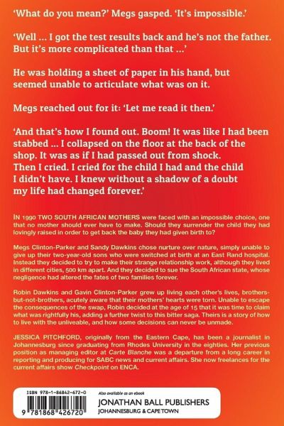 'What do you mean?' Megs gasped. 'It's impossible.' 'Well ... I got the test results back and he's not the father. But it's more complicated than that ...' He was holding a sheet of paper in his hand, but seemed unable to articulate what was on it. Megs reached out for it: 'Let me read it then.' 'And that's how I found out. Boom! It was like I had been stabbed ... I collapsed on the floor at the back of the shop. It was as if I had passed out from shock. Then I cried. I cried for the child I had and the child I didn't have. I knew without a shadow of a doubt my life had changed forever.' In 1990 two South African mothers were faced with an impossible choice, one that no mother should ever have to make. Should they surrender the child they had lovingly raised in order to get back the baby they had given birth to? Megs Clinton-Parker and Sandy Dawkins chose nurture over nature, simply unable to give up their two-year-old sons who were switched at birth at an East Rand Hospital. Instead they decided to try to make their strange relationship work, although they lived in different cities, 500 km apart. And they decided to sue the South African state, whose negligence had altered the fates of two families forever. Robin Dawkins and Gavin Clinton-Parker grew up living each other's lives, brothers-but-not-brothers, acutely aware that their mothers' hearts were torn. Unable to escape the consequences of the swap, Robin decided at the age of 15 that it was time to claim what was rightfully his, adding a further twist to this bitter saga. Theirs is a story of how to live with the unliveable, and how some decisions can never be unmade.
