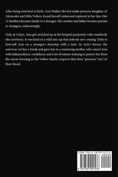 After being switched at birth, Aria Walker the lost mafia princess daughter of Alexander and Mila Volkov, found herself stolen and replaced in her fate. Her 11 brothers became family to a stranger. Her mother and father became parents to strangers, unknowingly. Only at 3 days, Aria got switched up at the hospital purposely with somebody else newborn. It was kind of a wild mix-up that nobody saw coming. Only to have left Aria on a stranger's doorstep with a note. In Aria's favour, the universe cut her a break and gave her to a nurturing mother who raised Aria with independence, confidence and a lot of intense training to protect her from the storm brewing as the Volkov family suspects that their "princess" isn't of their blood.