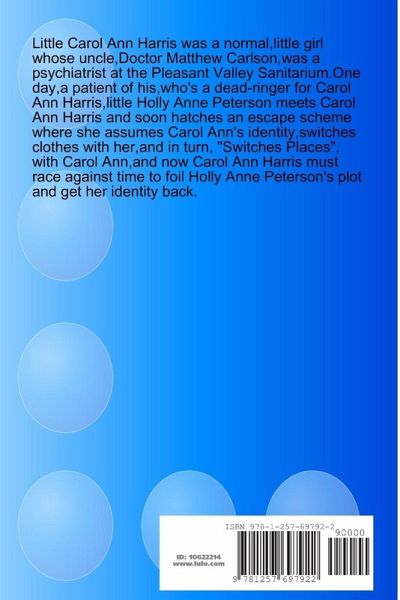 Little Carol Ann Harris was a normal,little girl whose uncle, Doctor Matthew Carlson,was a psychiatrist at the Pleasant Valley Sanitarium.One day,a patient of his,who's a dead-ringer for Carol Ann Harris,little Holly Anne Peterson meets Carol Ann Harris and soon hatches an escape scheme where she assumes Carol Ann's identity,switches clothes with her,and in turn, "Switches Places", with Carol Ann,and now Carol Ann Harris must race against time to foil Holly Anne Peterson's plot and get her identity back.