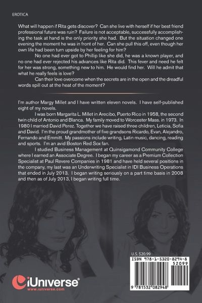 I'm author Margy Millet and I have written eleven novels. I have self-published eight of my novels. I was born Margarita L. Millet in Arecibo, Puerto Rico in 1958, the second twin child of Antonio and Blanca. My family moved to Worcester Mass. in 1973. In 1980 I married David Perez. Together we have raised three children, Leticia, Sofia and David. I'm the proud grandmother of five grandsons Ricardo, Evan, Alejandro, Fernando and Emmitt. My passions include writing, Latin music, dancing, reading and sports. I'm an avid Boston Red Sox fan. I studied Business Management at Quinsigamond Community College where I earned an Associate Degree. I began my career as a Premium Collection Specialist at Paul Revere Companies in 1981 and have held several positions in the company, my last was an Underwriting Specialist in IDI Business Operations that ended in July 2013. I began writing seriously on a part time basis in 2008 and then as of July 2013, I began writing full time.