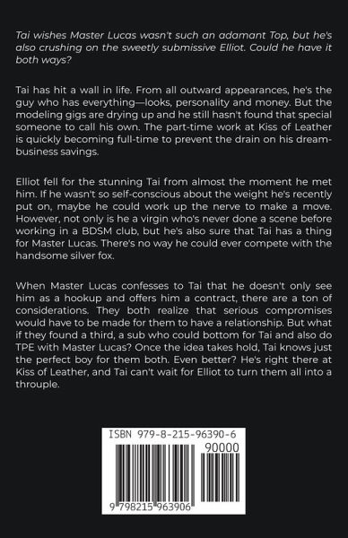 Tai wishes Master Lucas wasn't such an adamant Top, but he's also crushing on the sweetly submissive Elliot. Could he have it both ways? Tai has hit a wall in life. From all outward appearances, he's the guy who has everything--looks, personality and money. But the modeling gigs are drying up and he still hasn't found that special someone to call his own. The part-time work at Kiss of Leather is quickly becoming full-time to prevent the drain on his dream-business savings. Elliot fell for the stunning Tai from almost the moment he met him. If he wasn't so self-conscious about the weight he's recently put on, maybe he could work up the nerve to make a move. However, not only is he a virgin who's never done a scene before working in a BDSM club, but he's also sure that Tai has a thing for Master Lucas. There's no way he could ever compete with the handsome silver fox. When Master Lucas confesses to Tai that he doesn't only see him as a hookup and offers him a contract, there are a ton of considerations. They both realize that serious compromises would have to be made for them to have a relationship. But what if they found a third, a sub who could bottom for Tai and also do TPE with Master Lucas? Once the idea takes hold, Tai knows just the perfect boy for them both. Even better? He's right there at Kiss of Leather, and Tai can't wait for Elliot to turn them all into a throuple.