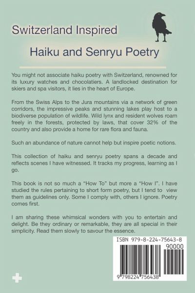 You might not associate haiku poetry with Switzerland, renowned for its luxury watches and chocolatiers. A landlocked destination for skiers and spa visitors, it lies in the heart of Europe. From the Swiss Alps to the Jura mountains via a network of green corridors, the impressive peaks and stunning lakes play host to a biodiverse population of wildlife. Wild lynx and resident wolves roam freely in the forests, protected by laws, that cover 32% of the country and also provide a home for rare flora and fauna. Such an abundance of nature cannot help but inspire poetic notions. Inhale the alpine mountain air, follow a breeze across a field of bowing grasses, close your eyes. Listen to the idle clonk of cowbells, the caw of crows and, in the far distance, a farm dog. Slowly exhale and open your eyes to the splendour of Switzerland. This collection of haiku and senryu poetry spans a decade and reflects scenes I have witnessed. It tracks my progress, learning as I go. This book is not so much a "How To" but more a "How I". I have studied the rules pertaining to short form poetry, but I tend to view them as guidelines only. Some I comply with, others I ignore. Poetry comes first. I am sharing these whimsical wonders with you to entertain and delight. Be they ordinary or remarkable, they are all special in their simplicity. Read them slowly to savour the essence.