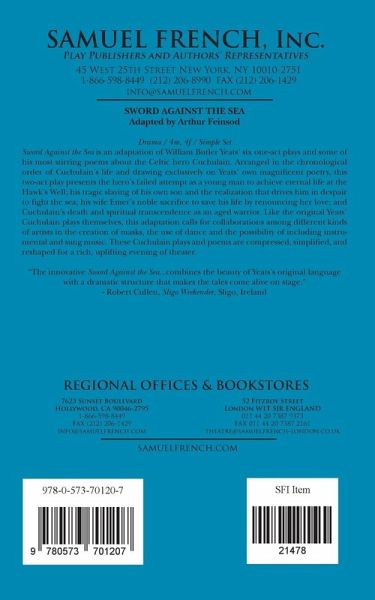 "Sword Against the Sea" is an adaptation of William Butler Yeats' six one-act plays and some of his most stirring poems about the Celtic hero Cuchulain. Arranged in the chronological order of Cuchulain's life and drawing exclusively on Yeats' own magnificent poetry, this two-act play presents the hero's failed attempt as a young man to achieve eternal life at the Hawk's Well; his tragic slaying of his own son and the realization that drives him in despair to fight the sea; his wife Emer's noble sacrifice to save his life by renouncing her love; and Cuchulain's death and spiritual transcendence as an aged warrior. Like the original Yeats' Cuchulain plays themselves, this adaptation calls for collaborations among different kinds of artists in the creation of masks, the use of dance and the possibility of including instrumental and sung music. These Cuchulain plays and poems are compressed, simplified, and reshaped for a rich, uplifting evening of theater.