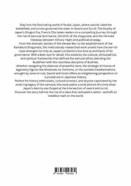 Step into the fascinating world of feudal Japan, where swords ruled the battlefield, and scrolls governed the state. In Sword and Scroll: The Duality of Japan's Shogun Era, Francis Cho takes readers on a compelling journey through the rise of samurai dominance, the birth of the shogunate, and the intricate interplay between military might and political strategy.From the dramatic battles of the Genpei War to the establishment of the Kamakura Shogunate, this meticulously researched work unveils how the warrior class emerged not only as Japan's protectors but also as architects of its governance. With a keen eye for detail, Cho explores the cultural, philosophical, and spiritual frameworks that defined the samurai ethos, blending Zen Buddhism with the relentless discipline of Bushido.Whether navigating the alliances of powerful clans, the strategic brilliance of legendary figures like Minamoto no Yoritomo, or the societal transformations wrought by samurai rule, Sword and Scroll offers an enlightening perspective on a pivotal era in Japanese history.Perfect for history enthusiasts, cultural scholars, and anyone captivated by the enduring legacy of the samurai, this book paints a vivid picture of a time when Japan's destiny was forged at the intersection of sword and scroll.Discover the story behind the rise of a class that reshaped a nation-and left an indelible mark on the world.