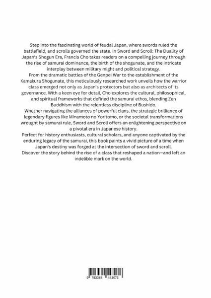 Step into the fascinating world of feudal Japan, where swords ruled the battlefield, and scrolls governed the state. In Sword and Scroll: The Duality of Japan's Shogun Era, Francis Cho takes readers on a compelling journey through the rise of samurai dominance, the birth of the shogunate, and the intricate interplay between military might and political strategy.From the dramatic battles of the Genpei War to the establishment of the Kamakura Shogunate, this meticulously researched work unveils how the warrior class emerged not only as Japan's protectors but also as architects of its governance. With a keen eye for detail, Cho explores the cultural, philosophical, and spiritual frameworks that defined the samurai ethos, blending Zen Buddhism with the relentless discipline of Bushido.Whether navigating the alliances of powerful clans, the strategic brilliance of legendary figures like Minamoto no Yoritomo, or the societal transformations wrought by samurai rule, Sword and Scroll offers an enlightening perspective on a pivotal era in Japanese history.Perfect for history enthusiasts, cultural scholars, and anyone captivated by the enduring legacy of the samurai, this book paints a vivid picture of a time when Japan's destiny was forged at the intersection of sword and scroll.Discover the story behind the rise of a class that reshaped a nation-and left an indelible mark on the world.