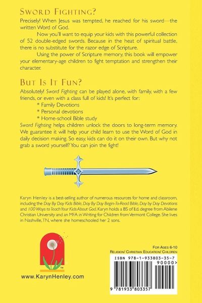 Sword Fighting? Precisely! When Jesus was tempted, he reached for his sword--the written Word of God. Now you'll want to equip your kids with this powerful collection of 52 double-edged swords. Because in the heat of spiritual battle, there is no substitute for the razor edge of Scripture. Using the power of Scripture memory, this book will empower your elementary-age children to fight temptation and strengthen their character. But Is It Fun? Absolutely! Sword Fighting can be played alone, with family, with a few friends, or even with a class full of kids! It's perfect for: * Family Devotions * Personal devotions * Home-school Bible study Sword Fighting helps children unlock the doors to long-term memory. We guarantee it will help your child learn to use the Word of God in daily decision making. So easy, kids can do it on their own. But why not grab a sword yourself? You can join the fight!