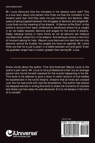 Mr. Louis discovers that the monsters in his dreams were real? This is a true story about one person who finds out that the monsters in his dreams were real. And they were not just monsters, but demons. After years of being trapped between the struggles of demons and angels Mr. Louis finds out the meaning of his dreams. ?A Demon at the Door? is this author?s recount from early childhood to adulthood where he is caught in an old battle between demons and angels for the world of dreams. Sadly, betrayal comes in many forms as not all demons are hideous monsters that visited him in his dreams. And betrayal comes in the form of innocent asking for help. Wayne Louis discovers too late that not only demons cannot be trusted, but angels too have an agenda. Mr. Lewis finds out that he is just a pawn in a battle between evil and good. Even his guardian angel had a mission greater than saving Mr. Louis.