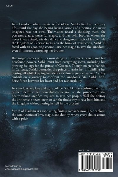 In a kingdom where magic is forbidden, Sashki lived an ordinary life-until the day she begins having visions of a destiny she never imagined was her own. The visions reveal a shocking truth: she possesses a rare, powerful magic, and her twin brother, whom she never knew existed, wields a dark and dangerous magic of his own. As the kingdom of Carserae teeters on the brink of destruction, Sashki is faced with an agonizing choice-use her magic to save the kingdom, even if it means destroying her brother. But magic comes with its own dangers. To protect herself and her newfound powers, Sashki must keep everything secret, including her growing feelings for the prince of Carserae. Though magic is banned in Carserae, Sashki persuades the prince to assist her in fulfilling her destiny, all while keeping her abilities a closely guarded secret. As they embark on a journey to confront the kingdom's fate, Sashki finds herself torn between her heart and her responsibility. In a world where love and duty collide, Sashki must confront the truth of her identity, her powerful connection to the prince, and the heartbreaking sacrifice required to save her people. Will she destroy the brother she never knew, or can she find a way to save both him and the kingdom without losing herself in the process? Sword of Hadrian is a captivating fantasy romance novel that explores the complexities of love, magic, and destiny, where every choice comes with a price.