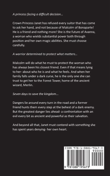 A princess facing a difficult decision... Crown Princess Janet has refused every suitor that has come to ask her hand, and not because of Malcolm of Bonaparte! He is a friend and nothing more! She is the future of Avanna, a woman who wields substantial power both through position and her own magic abilities. She must choose carefully. A warrior determined to protect what matters... Malcolm will do what he must to protect the woman who has always been his closest friend. Even if that means lying to her- about who he is and what he feels. And when her family falls under a dark curse, he is the only one she can trust to get her to the Forest Tower, home of the ancient wizard, Merlin. Seven days to save the kingdom... Dangers lie around every turn in the road and a former friend hunts them every step at the behest of a dark enemy. But the greatest danger lies ahead- a confrontation with an evil every bit as ancient and powerful as their salvation. And beyond all that, Janet must contend with something she has spent years denying- her own heart.