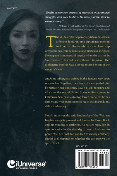 "Emilio presents an engrossing story rich with samurai struggles and rich texture. He really knows how to weave a story!" -William J. Hall, author of The World's Most Haunted House: The True Story of the Bridgeport Poltergeist on Lindley Street The all-powerful emperor sends Sen-hi Sakeda, a female Samurai, on a diplomatic mission to America. She travels on a merchant ship across the sea from Japan, slaying pirates as she goes. She expects a moment of respite when she arrives in San Francisco. Instead, she is thrown in prison. Her diplomatic mission was a set-up to get her out of the emperor's way. An Army officer, also trained in the Samurai way, soon rescues her. Together, they learn of a misguided plot by Native American chief, Raven Black, to usurp and take over the seat of United States military power in California. Sen-hi vows to stop Raven Black, but he has dark magic with unprecedented reach that makes him a difficult adversary. Sen-hi traverses the epic landmarks of the Western frontier as she is pursued and hunted by Raven Black and his minions of darkness. As battles rage, Sen-hi questions whether she should go to war or find a way to peace. Will her final decision lead to victory or bloody death? It all depends on whether she can survive the spirit of evil.