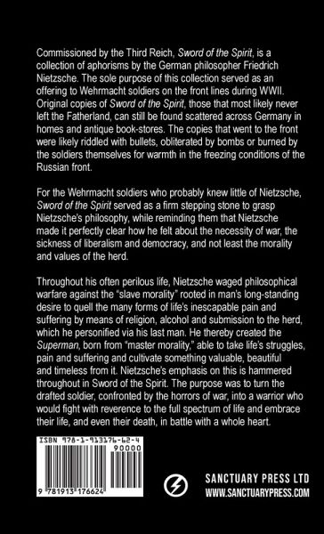 Commissioned by the Third Reich, Sword of the Spirit, is a collection of aphorisms by the German philosopher Friedrich Nietzsche. The sole purpose of this collection served as an offering to Wehrmacht soldiers on the front lines during WWII. Original copies of Sword of the Spirit, those that most likely never left the Fatherland, can still be found scattered across Germany in homes and antique book-stores. The copies that went to the front were likely riddled with bullets, obliterated by bombs or burned by the soldiers themselves for warmth in the freezing conditions of the Russian front. For the Wehrmacht soldiers who probably knew little of Nietzsche, Sword of the Spirit served as a firm stepping stone to grasp Nietzsche's philosophy, while reminding them that Nietzsche made it perfectly clear how he felt about the necessity of war, the sickness of liberalism and democracy, and not least the morality and values of the herd. Throughout his often perilous life, Nietzsche waged philosophical warfare against the "slave morality" rooted in man's long-standing desire to quell the many forms of life's inescapable pain and suffering by means of religion, alcohol and submission to the herd, which he personified via his last man. He thereby created the Superman, born from "master morality," able to take life's struggles, pain and suffering and cultivate something valuable, beautiful and timeless from it. Nietzsche's emphasis on this is hammered throughout in Sword of the Spirit. The purpose was to turn the drafted soldier, confronted by the horrors of war, into a warrior who would fight with reverence to the full spectrum of life and embrace their life, and even their death, in battle with a whole heart.