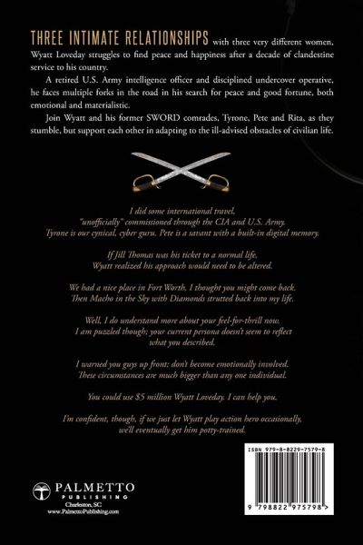 Three intimate relationships with three very different women, Wyatt Loveday struggles to find peace and happiness after a decade of clandestine service to his country. A retired U.S. Army intelligence officer and disciplined undercover operative, he faces multiple forks in the road in his search for peace and good fortune, both emotional and materialistic. Join Wyatt and his form SWORD comrades, Tyrone, Pete and Rita, as they stumble but support each other in adapting to the ill-advised obstacles of civilian life.