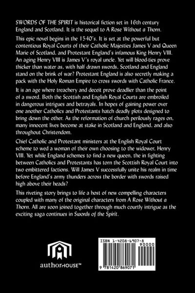 Swords of the Spirit is historical fiction set in 16th century England and Scotland. It is the sequel to A Rose Without a Thorn. This epic novel begins in the 1540's. It is set at the powerful but contentious Royal Courts of their Catholic Majesties James V and Queen Marie of Scotland, and Protestant England's infamous King Henry VIII. An aging Henry VIII is James V's royal uncle. Yet will blood-ties prove thicker than water as, with half drawn swords, Scotland and England stand on the brink of war? Protestant England is also secretly making a pack with the Holy Roman Empire to cross swords with Catholic France. It is an age where treachery and deceit prove deadlier than the point of a sword. Both the Scottish and English Royal Courts are embroiled in dangerous intrigues and betrayals. In hopes of gaining power over one another Catholics and Protestants hatch deadly plots designed to bring down the other. As the reformation of church perilously rages on, many innocent lives become at stake in Scotland and England, and also throughout Christendom. Chief Catholic and Protestant ministers at the English Royal Court scheme to wed a woman of their own choosing to the widower, Henry VIII. Yet while England schemes to find a new queen, the in fighting between Catholics and Protestants has torn the Scottish Royal Court into two embittered factions. Will James V successfully unite his realm in time before England's army thunders across the border with swords raised high above their heads? This riveting story brings to life a host of new compelling characters coupled with many of the original characters from A Rose Without a Thorn. All are soon joined together through much courtly intrigue as the exciting saga continues in Swords of the Spirit.