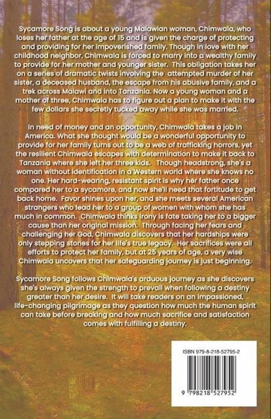 Sycamore Song is about a young Malawian woman, Chimwala, who loses her father at the age of 15 and is given the charge of protecting and providing for her impoverished family. Though in love with her childhood neighbor, Chimwala is forced to marry into a wealthy family to provide for her mother and younger sister. This obligation takes her on a series of dramatic twists involving the attempted murder of her sister, a deceased husband, the escape from his abusive family, and a trek across Malawi and into Tanzania. Now a young woman and a mother of three, Chimwala has to figure out a plan to make it with the few dollars she secretly tucked away while she was married. In need of money and an opportunity, Chimwala takes a job in America. What she thought would be a wonderful opportunity to provide for her family turns out to be a web of trafficking horrors, yet the resilient Chimwala escapes with determination to make it back to Tanzania where she left her three kids. Though headstrong, she's a woman without identification in a Western world where she knows no one. Her hard-wearing, resistant spirit is why her father once compared her to a sycamore, and now she'll need that fortitude to get back home. Favor shines upon her, and she meets several American strangers who led her to a group of women with whom she has much in common. Chimwala thinks irony is fate taking her to a bigger cause than her original mission. Through facing her fears and challenging her God, Chimwala discovers that her hardships were only stepping stones for her life's true legacy. Her sacrifices were all efforts to protect her family, but at 25 years of age, a very wise Chimwala uncovers that her safeguarding journey is just beginning. Sycamore Song follows Chimwala's arduous journey as she discovers she's always given the strength to prevail when following a destiny greater than her desire. It will take readers on an impassioned, life-changing pilgrimage as they question how much the human spirit can take before breaking and how much sacrifice and satisfaction comes with fulfilling a destiny.
