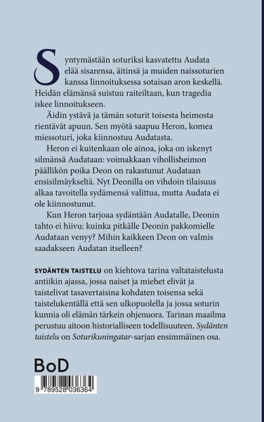 Syntymästään soturiksi kasvatettu Audata elää sisarensa, äitinsä ja muiden naissoturien kanssa linnoituksessa sotaisan aron keskellä. Heidän elämänsä suistuu raiteiltaan, kun tragedia iskee linnoitukseen. Äidin ystävä ja tämän soturit toisesta heimosta rientävät apuun. Sen myötä saapuu Heron, komea miessoturi, joka kiinnostuu Audatasta. Heron ei kuitenkaan ole ainoa, joka on iskenyt silmänsä Audataan: voimakkaan vihollisheimon päällikön poika Deon on rakastunut Audataan ensisilmäykseltä. Nyt Deonilla on vihdoin tilaisuus alkaa tavoitella sydämensä valittua, mutta Audata ei ole kiinnostunut. Kun Heron tarjoaa sydäntään Audatalle, Deonin tahto ei hiivu: kuinka pitkälle Deonin pakkomielle Audataan venyy? Mihin kaikkeen Deon on valmis saadakseen Audatan itselleen? Sydänten taistelu kuljettaa lukijansa antiikin aikaan aitoon historialliseen todellisuuteen aron juonittelujen ja sotien keskelle, missä naiset ryntäävät taisteluun miekat käsissään siinä missä miehetkin.
