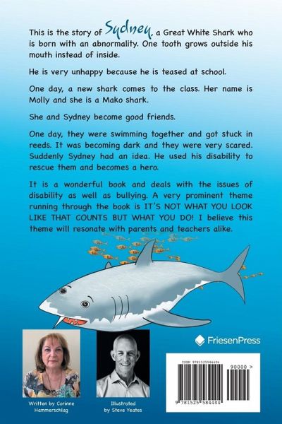 This is the story of Sydney, a Great White Shark who is born with an abnormality. One tooth grows outside his mouth instead of inside. He is very unhappy because he is teased at school. One day, a new shark comes to the class. Her name is Molly and she is a Mako shark. She and Sydney become good friends. One day, they were swimming together and got stuck in reeds. It was becoming dark and they were very scared. Suddenly Sydney had an idea. He used his disability to rescue them and becomes a hero. It is a wonderful book and deals with the issues of disability as well as bullying. A very prominent theme running through the book is IT'S NOT WHAT YOU LOOK LIKE THAT COUNTS BUT WHAT YOU DO! I believe this theme will resonate with parents and teachers alike.