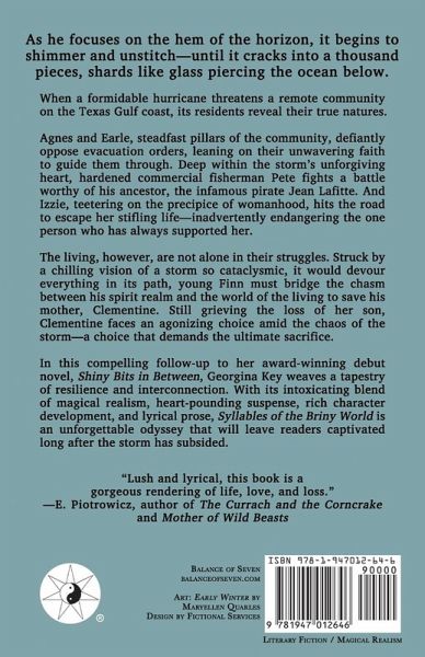 As he focuses on the hem of the horizon, it begins to shimmer and unstitch-until it cracks into a thousand pieces, shards like glass piercing the ocean below.When a formidable hurricane threatens a remote community on the Texas Gulf coast, its residents reveal their true natures.Agnes and Earle, steadfast pillars of the community, defiantly oppose evacuation orders, leaning on their unwavering faith to guide them through. Deep within the storm's unforgiving heart, hardened commercial fisherman Pete fights a battle worthy of his ancestor, the infamous pirate Jean Lafitte. And Izzie, teetering on the precipice of womanhood, hits the road to escape her stifling life-inadvertently endangering the one person who has always supported her.The living, however, are not alone in their struggles. Struck by a chilling vision of a storm so cataclysmic, it would devour everything in its path, young Finn must bridge the chasm between his spirit realm and the world of the living to save his mother, Clementine. Still grieving the loss of her son, Clementine faces an agonizing choice amid the chaos of the storm-a choice that demands the ultimate sacrifice.In this compelling follow-up to her award-winning debut novel, Shiny Bits in Between, Georgina Key weaves a tapestry of resilience and interconnection. With its intoxicating blend of magical realism, heart-pounding suspense, rich character development, and lyrical prose, Syllables of the Briny World is an unforgettable odyssey that will leave readers captivated long after the storm has subsided.