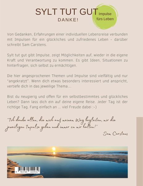 SYLT TUT GUT - Impulse fürs Leben. Von Gedanken, Erfahrungen einer individuellen Lebensreise verbunden mit Impulsen für ein glückliches und zufriedenes Leben - darüber schreibt Sam Carstens. Sylt tut gut gibt Impulse, zeigt Möglichkeiten auf, wieder in die eigene Kraft und Verantwortung zu kommen. Es gibt Ideen, Situationen zu hinterfragen, sich selbst zu ermächtigen. Ergänzt mit Zitaten und tollen Impressionen lädt das Buch zum Nachdenken und Träumen ein. Die hier angesprochenen Themen und Impulse sind vielfältig und nur "angekratzt". Wenn dich etwas besonders interessiert und anspricht, vertiefe dich in das jeweilige Thema. Bist du neugierig und offen für ein selbstbestimmtes und glückliches Leben? Dann lass dich ein auf deine eigene Reise. Jeder Tag ist der richtige Tag. Fang einfach an... viel Freude dabei :-)