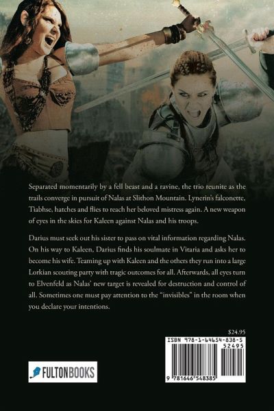 Separated momentarily by a fell beast and a ravine, the trio reunite as the trails converge in pursuit of Nalas at Slithon Mountain. Lynerin’s falconette, Tiabhse, hatches and flies to reach her beloved mistress again. A new weapon of eyes in the skies for Kaleen against Nalas and his troops. Darius must seek out his sister to pass on vital information regarding Nalas. On his way to Kaleen, Darius finds his soulmate in Vitaria and asks her to become his wife. Teaming up with Kaleen and the others they run into a large Lorkian scouting party with tragic outcomes for all. Afterwards, all eyes turn to Elvenfeld as Nalas’ new target is revealed for destruction and control of all. Sometimes one must pay attention to the "invisibles" in the room when you declare your intentions.